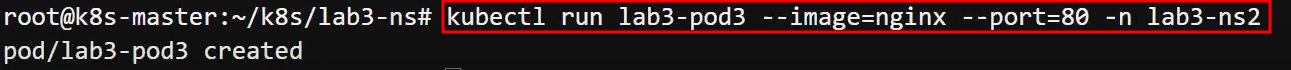kubectl run lab3-pod3 --image=nginx --port=80 -n lab3-ns2