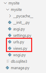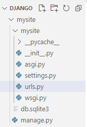 manage.py - django 프로젝트를 진행하고 관리하는 데에 필요한 유틸리티 프로그램 mysite (project name과 동일 폴더) - 프로젝트 전체를 관리하는 폴더 mysite/settings.py: 프로젝트의 환경 설정 mysite/urls.py: 사이트의 main URL 관리 |