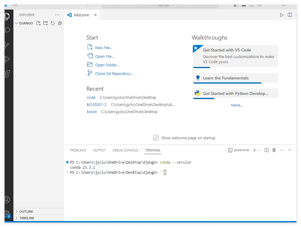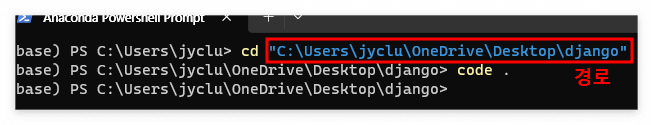code . 코드를 통해 가상환경 VSCODE 실행된다.