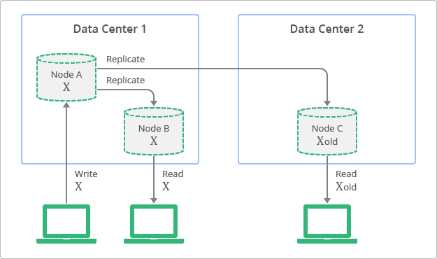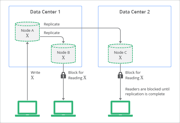 예를 들어, 위 구성에서는 복제가 완료되기 전까지 다른 노드의 읽기 연산을 차단하여 강한 일관성을 달성할 수 있다. 하지만, 클라이언트로부터의 요청을 처리할 수 없다는 점에서 가용성이 희생된다는 단점이 있다.