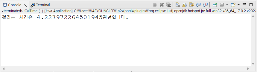 System.out.println("걸리는 시간은 "+ light_year +"광년입니다.");