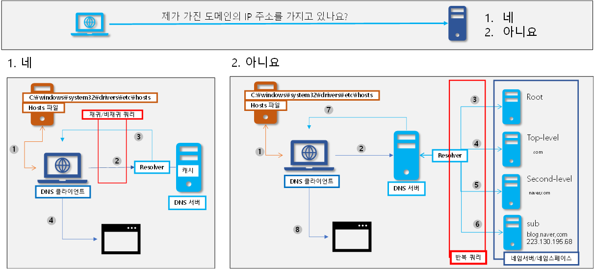 내 컴퓨터가 blog.naver.com이라는 도메인에 접속하려 합니다.