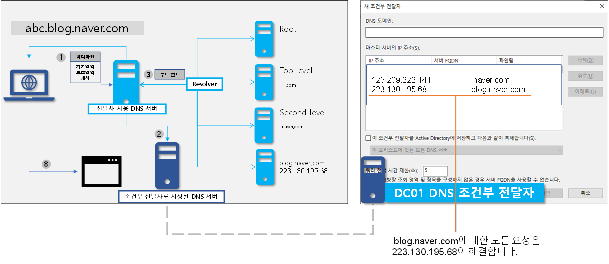 조건부 전달자는 특정 도메인 네임을 설정한 DNS 서버에 물어보는 것입니다.