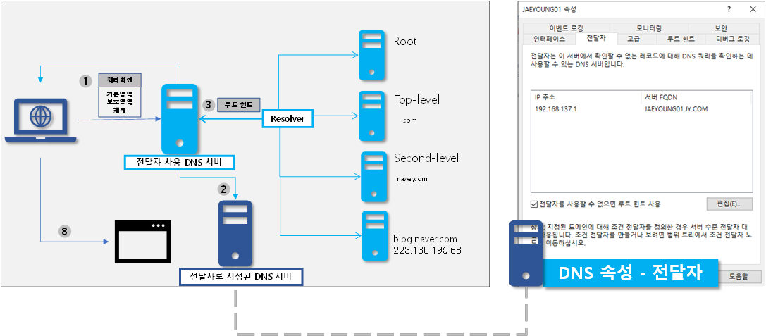 2번 과정에서 이름 쿼리가 로컬 영역 데이터 또는 캐시를 사용하여. 따라서 이름을 확인할 수 없는 경우 전달자로 지정된 DNS 서버로 쿼리를 전달합니다