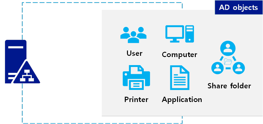 이러한 객체는 유일한 식별성을 가지며 보편적인 AD 객체 유형으로는 사용자, 컴퓨터, 애플리케이션, 프린터, 공유 폴더 등이 있습니다. 일부 객체는 다른 객체를 포함할 수 있습니다.