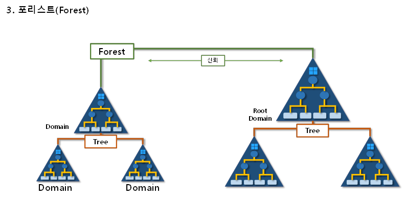 포리스트는 보안 경계입니다. 서로 다른 포리스트의 객체는 각 포리스트의 관리자가 해당 객체간 신뢰를 형성하지 않는 한 상호 작용할 수 없습니다.