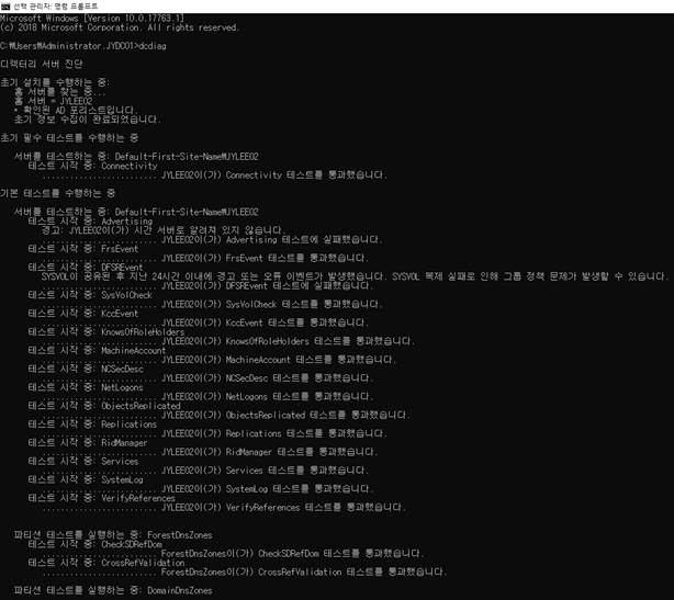 관리자 권한으로 실행하여 dcdiag를 입력하면 성공과 실패한 항목에 대해서 표시가 됩니다.