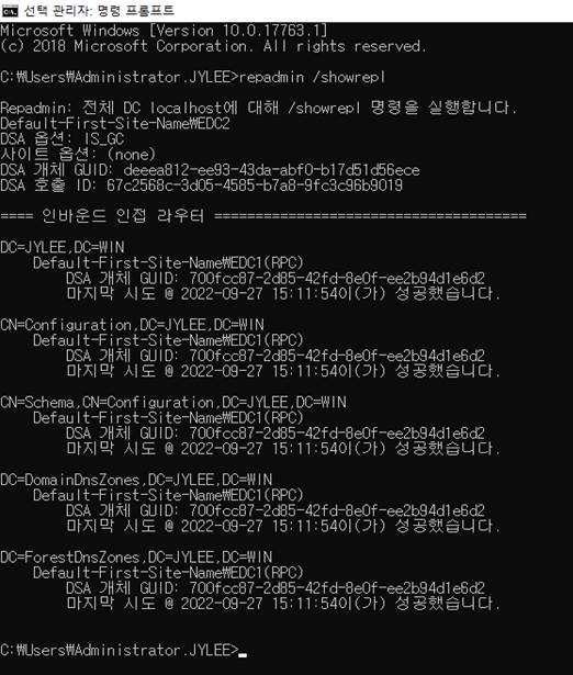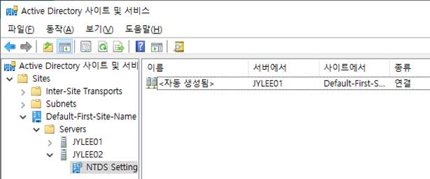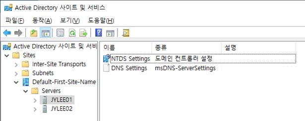 수동복제 방법 : Active Directory 사이트 및 서비스 – Sites – Default – First-Site-Name-Servers 를 통해 DC를 확인할 수 있습니다.