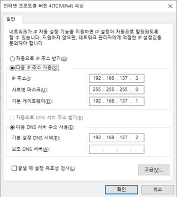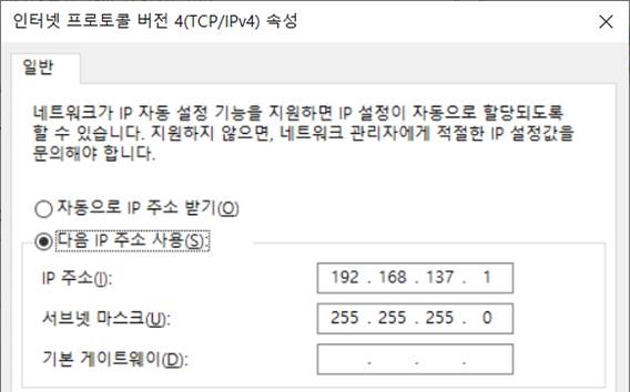 JY-DC0의 경우 IP주소 192.168.137.2, 게이트웨이 192.168.137.1