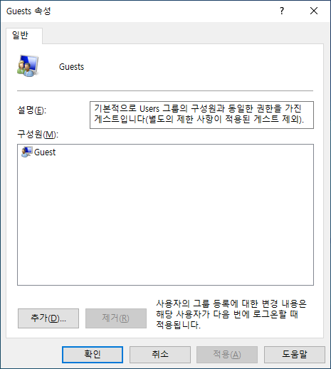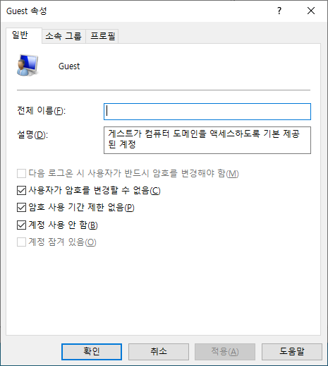 *guest 계정 : 불특정 다수의 접근을 허용하는 취약한 계정입니다. 게스트가 컴퓨터 및 도메인을 엑세스 하도록 기본 제공된 것으로서 외부 사용자가 컴퓨터를 잠시 접근할 수 있으나 소프트웨어, 하드웨어 설치 또는 설정변경, 암호 만들기와 같은 설정은 불가능 로그온할 때 임시 프로필을 만들고 로그아웃 하면 삭제됨