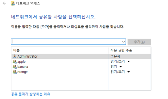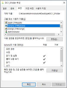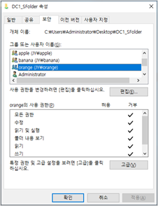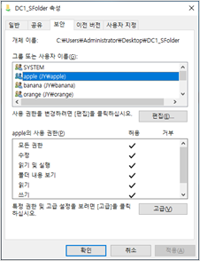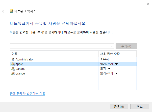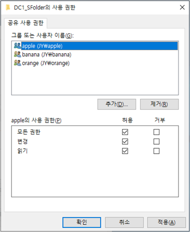 공유 사용 권한 설정 : everyone 사용자를 삭제하고 apple, banana, orange 그룹을 추가해줬습니다.