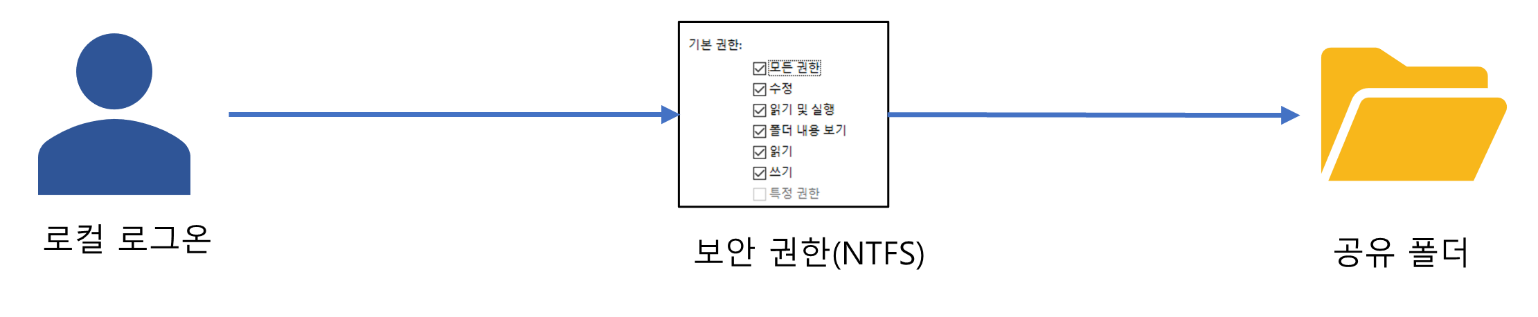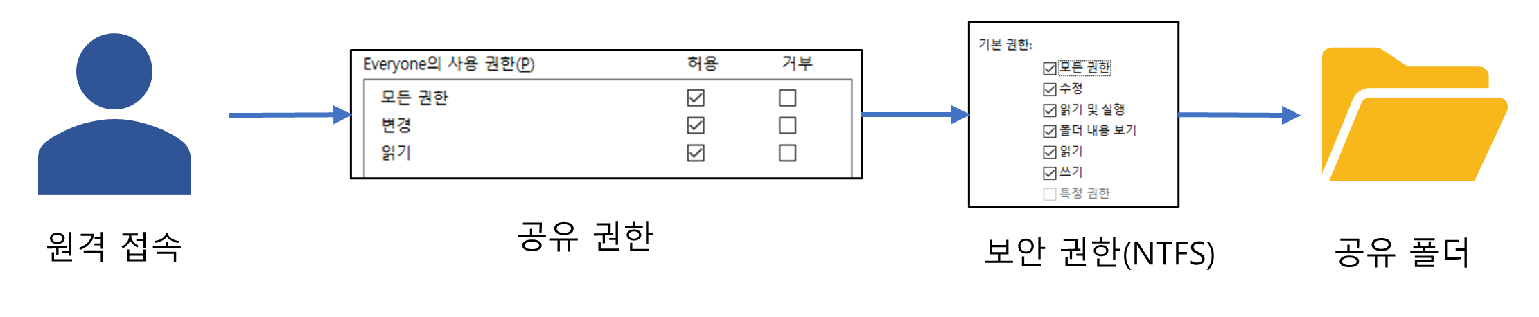 보안 권한(NTFS) : 로컬에서 접근하는 사용자 제어 (읽기 및 실행, 쓰기, 수정, 모든 권한)