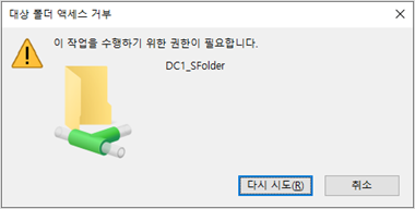공유 권한 : 전체 / 모든 권한 : 읽기 설정 에서 새 폴더를 생성했을 때 나타나는 대상 폴더 액세스 거부 창은 공유 폴더 접근 권한에 대한 액세스 거부 창 이였으며, 공유 권한 : 변경+읽기 / 보안 권한 : 읽기와 공유 권한 : 읽기 / 보안 권한 : 읽기 그리고 공유 권한 : 읽기 / 보안 권한 : 모든 권한 에서 나타나는 대상 폴더 액세스 거부 창은 공유 폴더 내부에 대한 액세스 거부 창임을 알 수 있었습니다. 이를 통해 공유 권한 과 보안 권한은 가장 제한적인 권한이 적용되지만 제한되는 범위에 차이가 있음을 추측할 수 있었습니다.