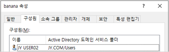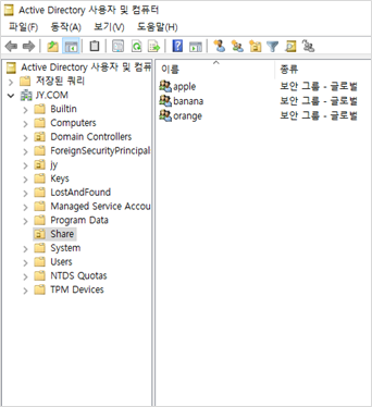 그룹 설정 : 사용자 JY USER01, JY USER02, JY USER03을 만들어 apple, banana, orange 그룹에 넣어줬습니다.