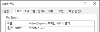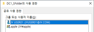 DC1_SFolder 공유 폴더에 apple 그룹과 apple 그룹 구성원인 JY USER01을 추가했습니다.