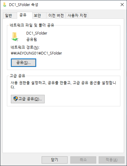 공유 권한과 보안 권한 각각 다르게 권한을 부여하고 이에 따른 결과를 확인 하는 방법으로 고급 공유가 적합하여 공유 권한과 보안 권한 부여 실습은 고급 공유 설정을 통해 진행하겠습니다.