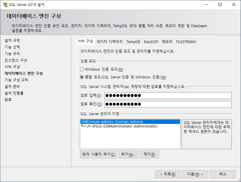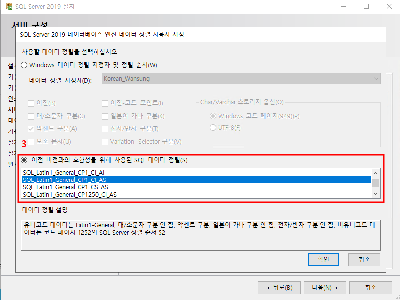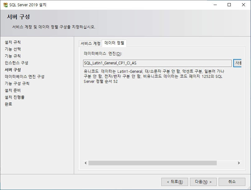 서비스 계정 입력이 완료되면 [데이터 정렬] 탭에서 [사용자 지정]을 통해 SQL Server 데이터베이스 엔진에서 사용할 정렬로 [SQL_Latin1_General_CP1_CI_AS]를 선택한다.