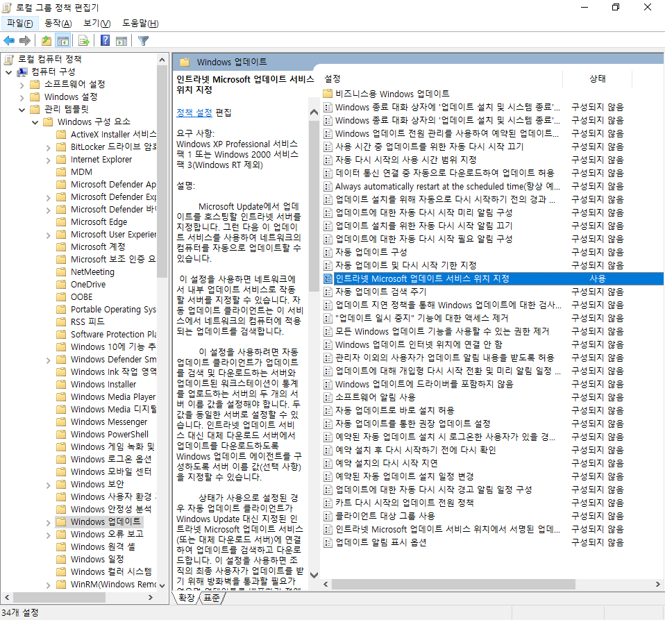 컴퓨터 구성 - 관리 템플릿 - Windows 구성요소 - Windows 업데이트 - 인트라넷 Microsoft 업데이트 서비스 위치 지정