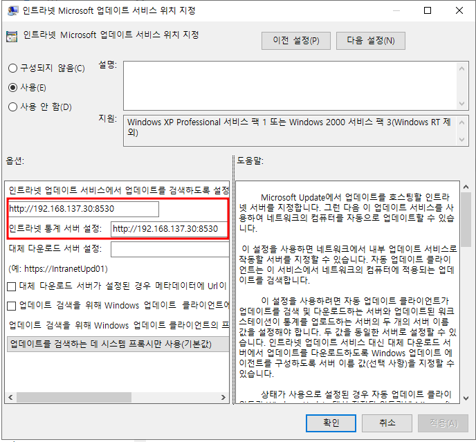 인트라넷 Microsoft 업데이트 서비스 위치 지정 설정 - 사용 -