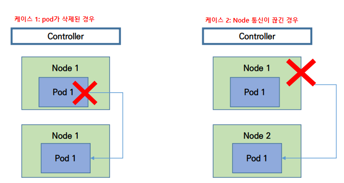 | Node 통신이 끊긴 경우 | pod1은 삭제 되지 않았지만 Node1과의 통신이 끊긴 경우 Controller는 pod1을 봐야 하기 때문에 Node2에 Pod1을 재배포 한다. |