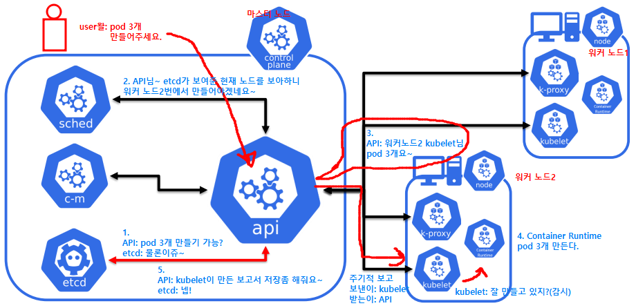 | API Server | API를 사용할 수 있게 해주는 프로세스 명령어가 전달되는 중간 다리 |