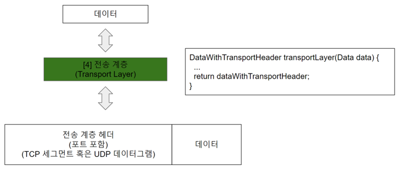 - 데이터를 받아서 TCP Segment 혹은 UDP Segment 중 하나의 전송 계층 헤더를 데이터에 붙여 캡슐화 한다.
