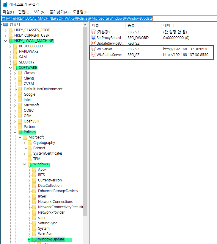 경로 : 컴퓨터\HKEY_LOCAL_MACHINE\SOFTWARE\Policies\Microsoft\Windows\WindowsUpdate